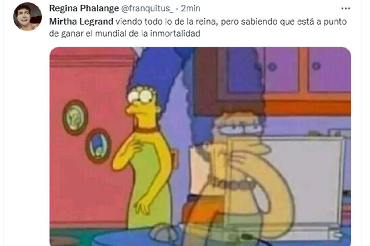 Como en cada muerte de alguna persona de avanzada edad, la figura de Mirtha Legrand vuelve a aparecer como una especia de "figura inmortal". Por eso, ya antes del fallecimiento de la reina Isabel II de Inglaterra, en las redes sociales comenzaron a aparecer los memes que se centraron en la figura de la conductora de los almuerzos.