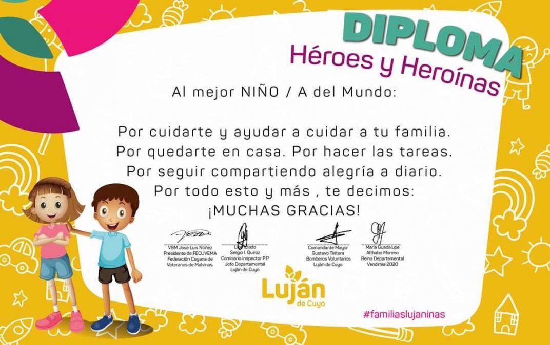 Más de 5.400 chicos de Luján de Cuyo recibieron el diploma de Héroes o Heroínas, como reconocimiento de la comuna y las instituciones locales a la colaboración y la paciencia demostrada en estos más de seis meses de cuarentena, con clases online y amigos y familiares a la distancia para prevenir contagios de coronavirus. La idea de entregar diplomas a cada niño que lo desee y se inscriba nació desde el municipio y fue articulada con los Bomberos Voluntarios, la Policía, Federación Cuyana de Veteranos de Malvinas y la Reina de la Vendimia, Guadalupe Althabe.