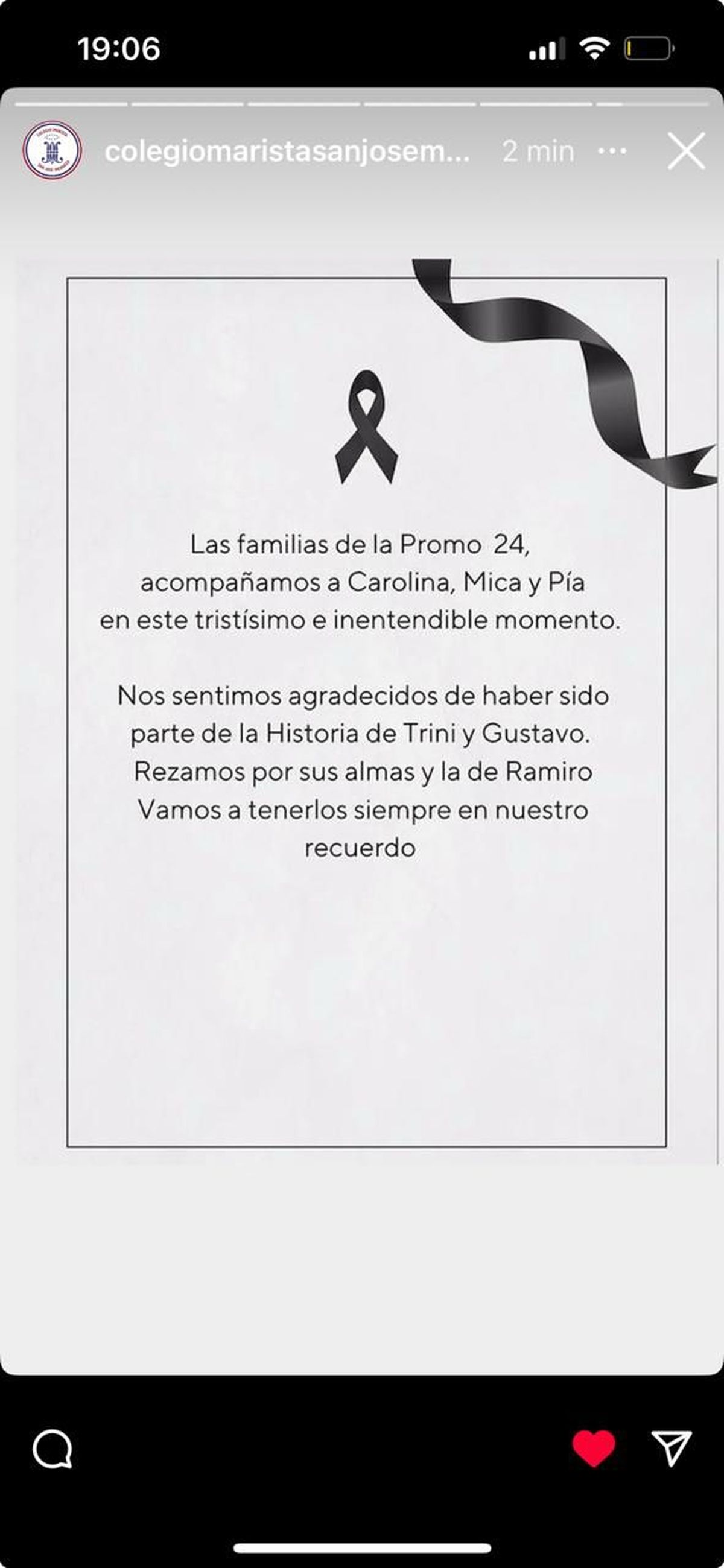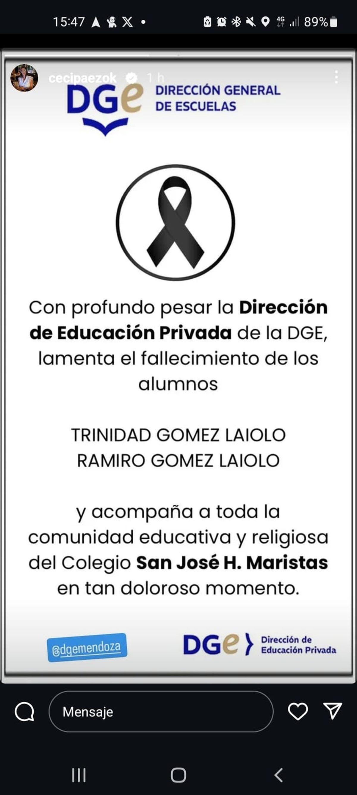 Tras conocerse la noticia de la tragedia de la Ruta 7 hubo algunos mensajes de dolor en redes sociales. Así, se expresaron desde la Dirección General sde Escuelas y del Colegio San José de los Hermanos Maristas.