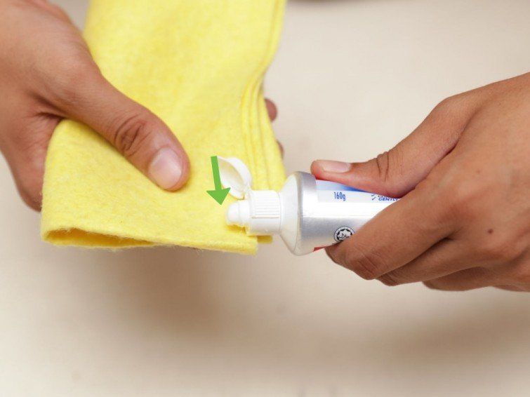 · Aplica un poco de pasta dental (sin gránulos ni efecto blanqueador) sobre un disco de aldogón o un paño natural. Frota con cuidado con movimientos circulares durante 10 segundos. Elimina los rastros de la pasta con agua.