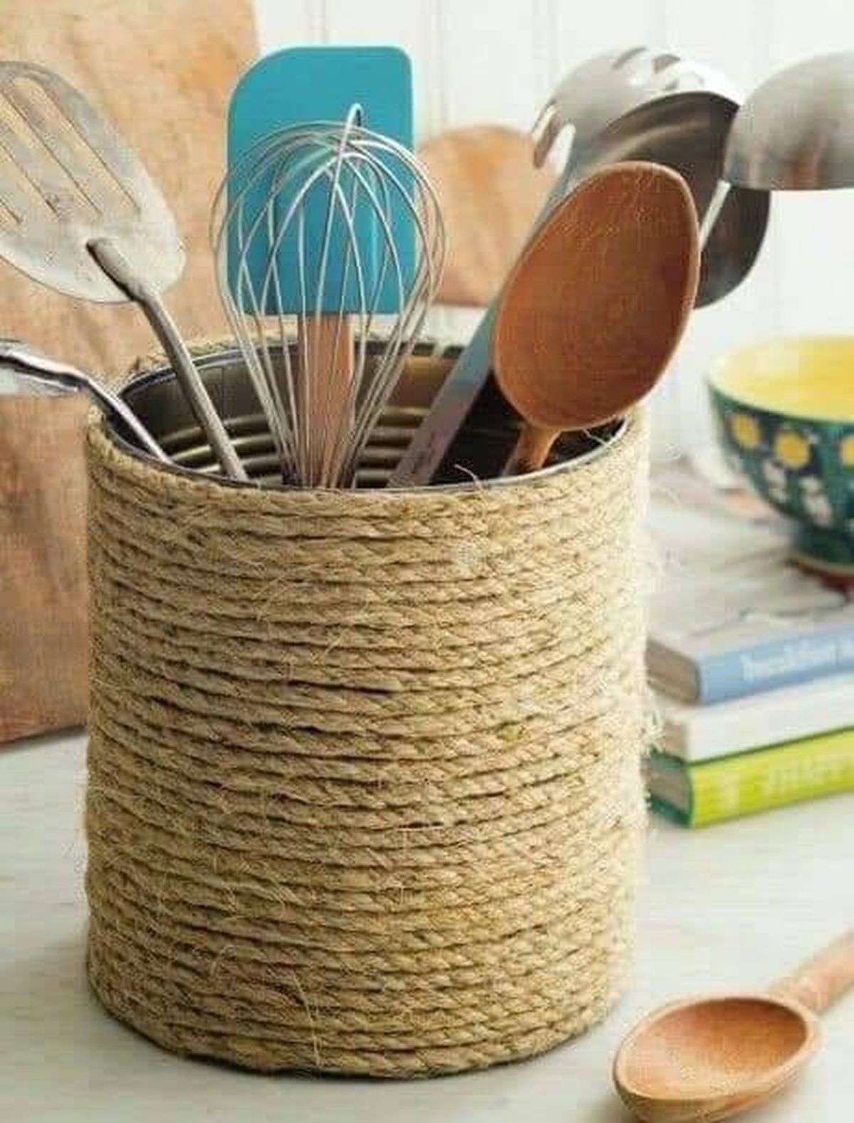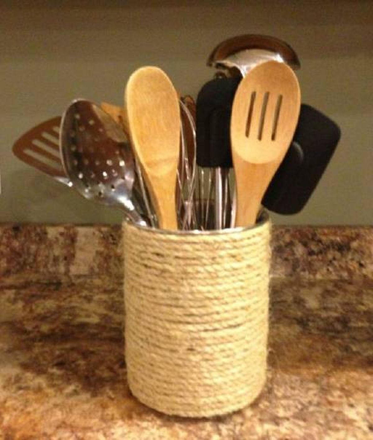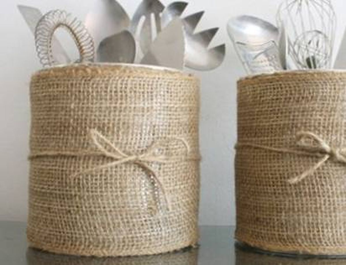 Luego puedes dejar el envase solo forrado con el hilo de yute o bien decorarlo con los accesorios que más te gusten. Por ejemplo algunos moños, cintas o retazos de tela, entre otras cosas. Lo importante es que dejes volar tu imaginación y le des tu toque personal. Así te quedará un porta utensilios muy lindo y útil para la cocina.