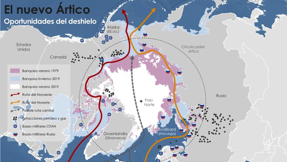 El interés por la porción de tierra del Ártico se disparó en las últimas décadas. A medida que el cambio climático reduce la extensión del hielo, surgen oportunidades económicas inéditas: acceso a recursos energéticos, pesca, y rutas que podrían acortar en miles de kilómetros los trayectos comerciales entre Asia, Europa y América.