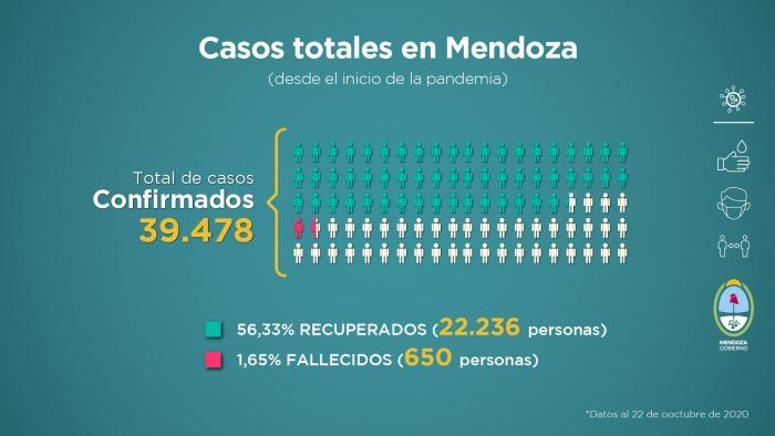 Desde que comenzó la pandemia, en Mendoza se registraron 39.478 casos confirmados de coronavirus, 22.236 recuperados y 650 fallecidos, lo que representa menos del 2% de las personas que contrajeron Covid-19 en la provincia, de acuerdo a las cifras oficiales que se dieron a conocer a través de diversas placas.