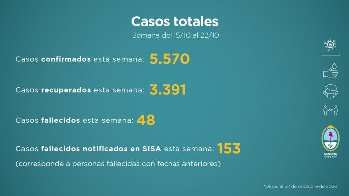 En cuanto a la cantidad de casos en la semana del 15 al 22 de octubre de 2020, las cifras alcanzaron 5.570 confirmados, 3.391 recuperados, 48 fallecidos y 153 casos fallecidos notificados en SISA esta semana (corresponde a personas fallecidas con fechas anteriores).
