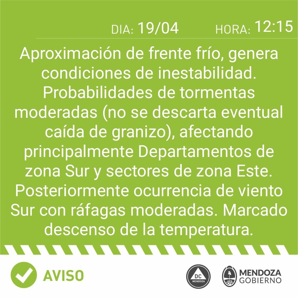 Defensa Civil del Gobierno de Mendoza comunicó una alerta para este martes 19 de abril que indica condiciones de inestabilidad con formaciones de tormentas y ocasional caída de granizo. Además se espera viento Sur con ráfagas moderadas.