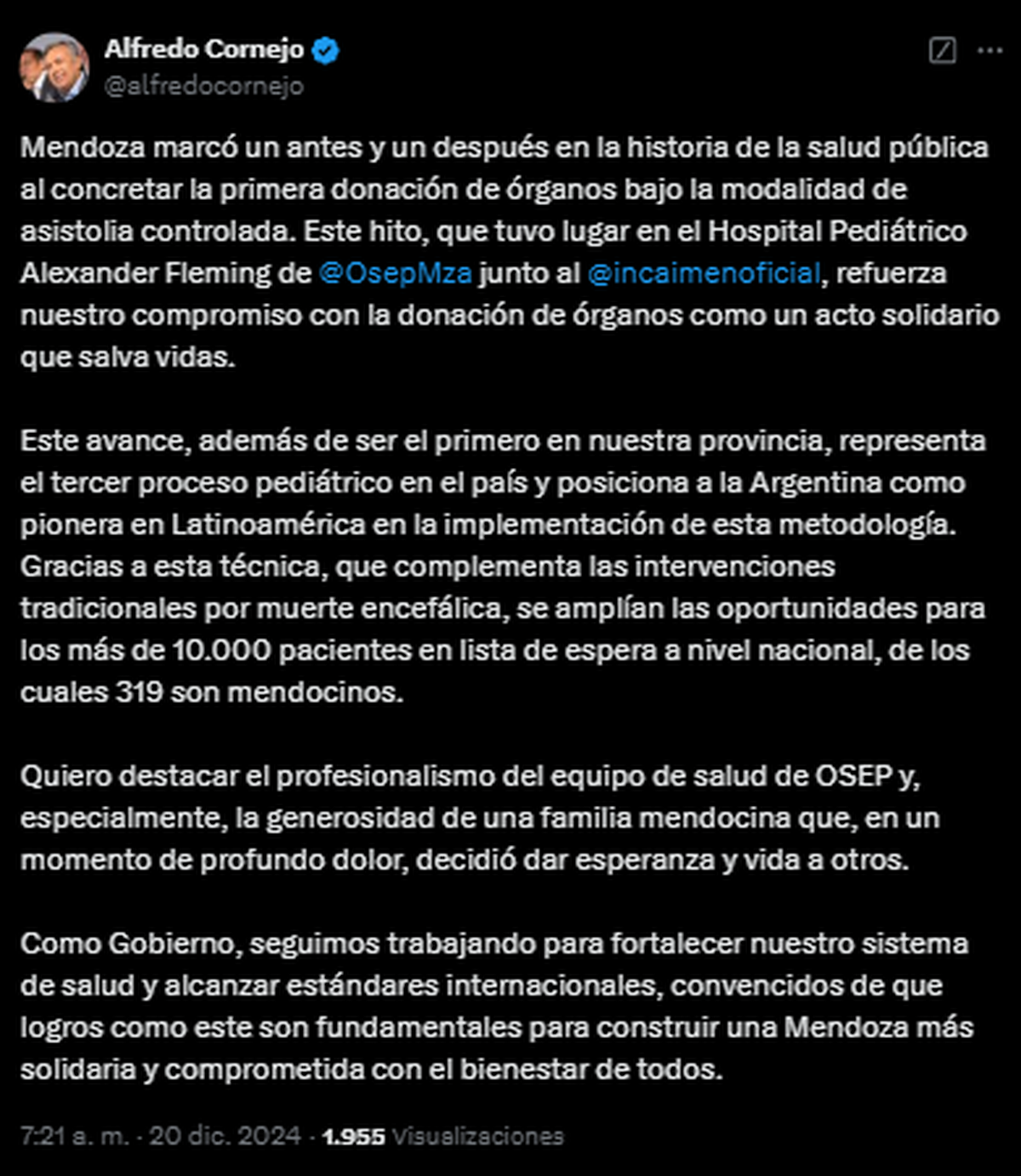"Mendoza marcó un antes y un después en la historia de la salud pública al concretar la primera donación de órganos bajo la modalidad de asistolia controlada. Este hito, que tuvo lugar en el Hospital Pediátrico Alexander Fleming de @OsepMza junto al @incaimenoficial, refuerza nuestro compromiso con la donación de órganos como un acto solidario que salva vidas. Este avance, además de ser el primero en nuestra provincia, representa el tercer proceso pediátrico en el país y posiciona a la Argentina como pionera en Latinoamérica en la implementación de esta metodología", posteó este viernes el gobernador en X.