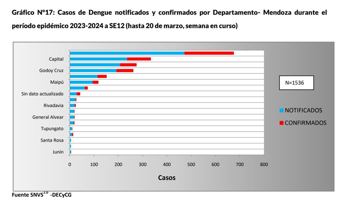 En cuanto a los departamentos más afectados, la gran mayoría de los enfermos son de la región metropolitana, y en menor medida del casco urbano de San Rafael.
