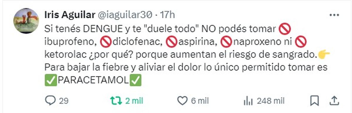 La directora del Vacunatorio Central, la doctora Iris Aguilar, recomendó este sábado: "Si tenés dengue y te 'duele todo', NO podés tomar ibuprofeno, diclofenac, aspirina, naproxeno ni ketorolac ¿Por qué? Porque aumentan el riesgo de sangrado. Para bajar la fiebre y aliviar el dolor lo único permitido tomar es paracetamol.
