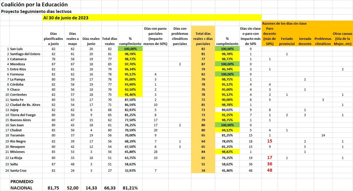 La Coalición por la Educación -una ONG que realiza este tipo de análisis- contabilizó la cantidad de días de clase planificados en las escuelas primarias y la comparó con los días efectivos de clase hasta el 30 de junio. De esos datos también surge que en Santa Cruz los estudiantes tuvieron sólo 27 días de clase este año. En Tucumán, Río Negro, Neuquén, Misiones, Tucumán, Neuquén, Río Negro, Salta y La Rioja cursaron menos de 60 días.