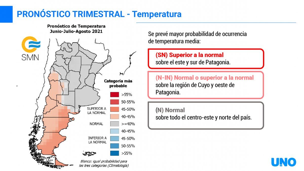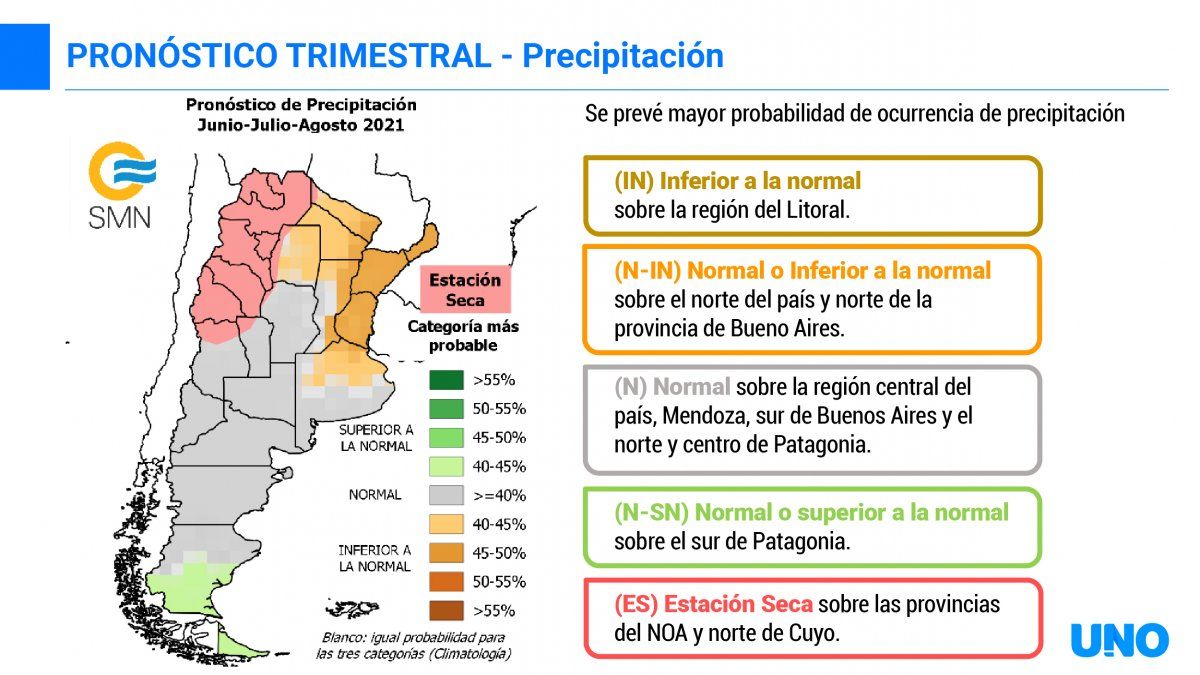 En cuanto a las precipitaciones, si bien nos encontramos en una estación seca, los datos del SMN muestran que Mendoza tendrá un periodo invernal en donde las lluvias serán normales, o superiores a lo normal.