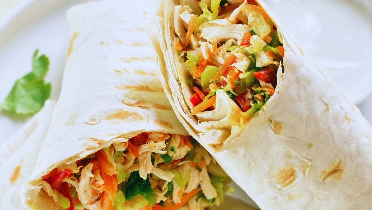 Almuerzo: Wrap de pollo con verduras asadas, hummus y espinacas