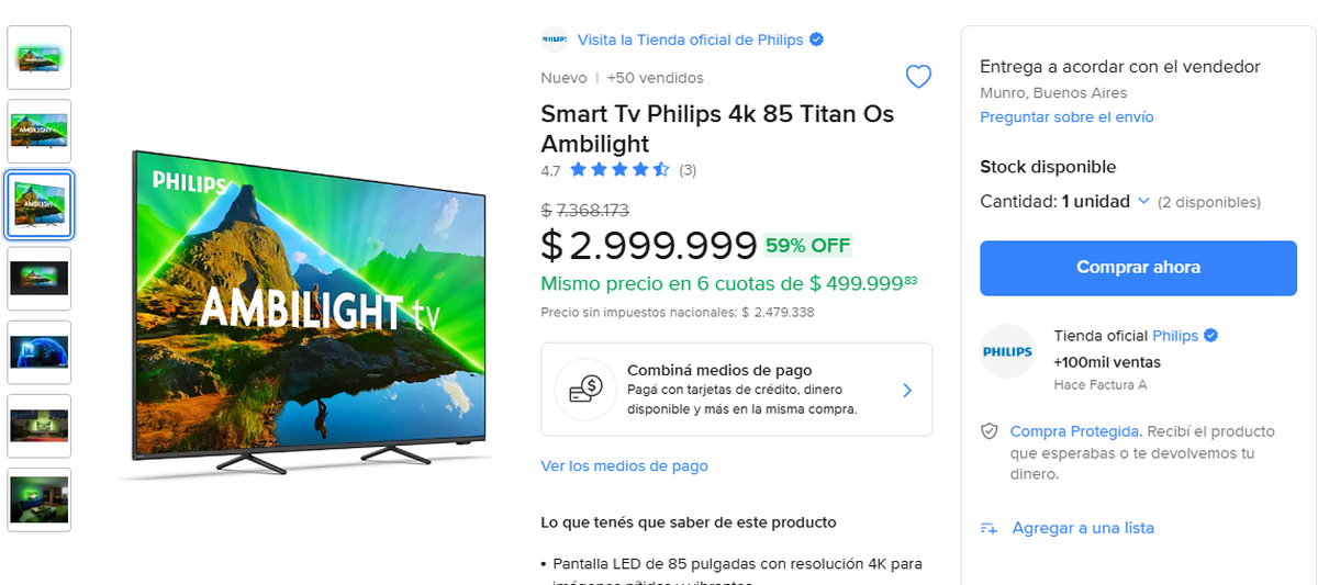 Pero el que más destaca es un televisor Smart TV de 85 pulgadas marca Philips. Según el sitio de Mercado Libre, el precio original es de $7.368.173 y se encuentra rebajado a $2.999.999, con la posibilidad de pagar en seis cuotas sin interés.