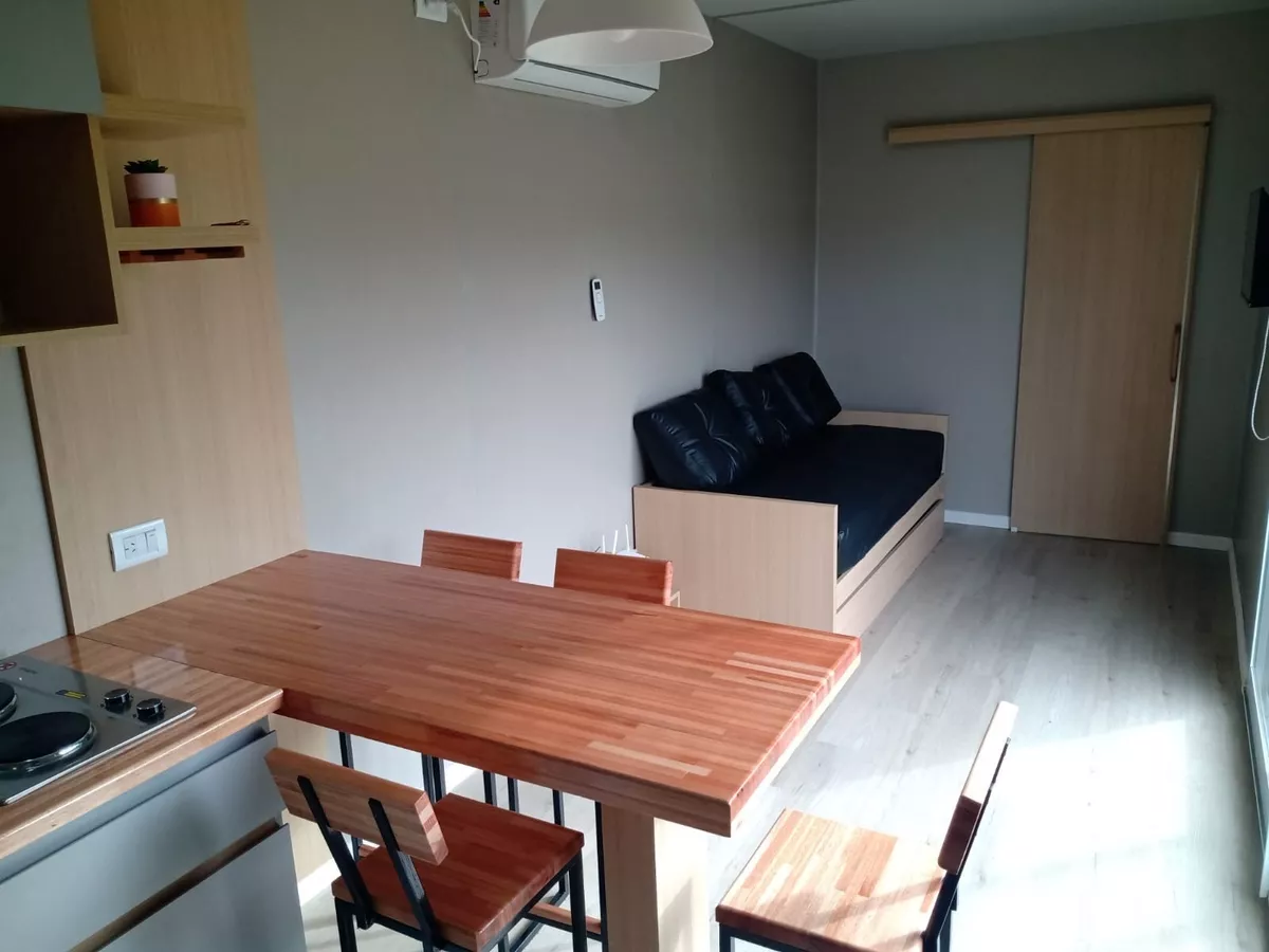 Asimismo, esta casa prefabricada presenta un dormitorio con vestidos, cama con respaldo y mesas de luz. En cuanto a la cocina comedor, esta tiene muebles a medida, que incluyen alacena, bajo mesada, barra, banquetas, sofá cama y un anafe eléctrico. Además, tiene un baño completo.