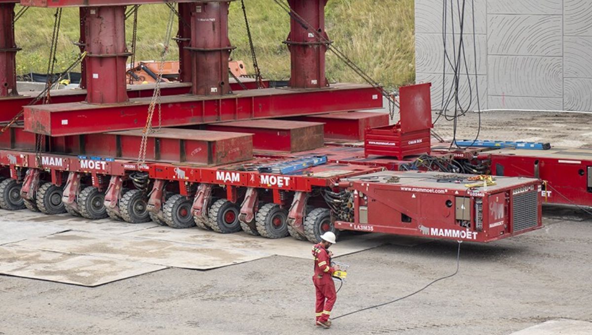 Mover una infraestructura de ese tamaño no es solo cuestión de fuerza, cada paso debía planificarse con exactitud milimétrica. La operación requirió SPMTs especializados capaces de distribuir uniformemente el peso, evitando cualquier deformación estructural y garantizando la estabilidad en todo momento.