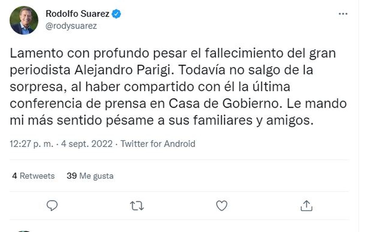 Se hizo querer, como lo demuestra la gran cantidad de mensajes publicados en redes sociales en las últimas horas, de los que mostramos algunos a los que luego se sumaron otros como el del gobernador Rodolfo Suarez, quien se manifestó sorprendido y recordó que participó de su última conferencia de prensa.