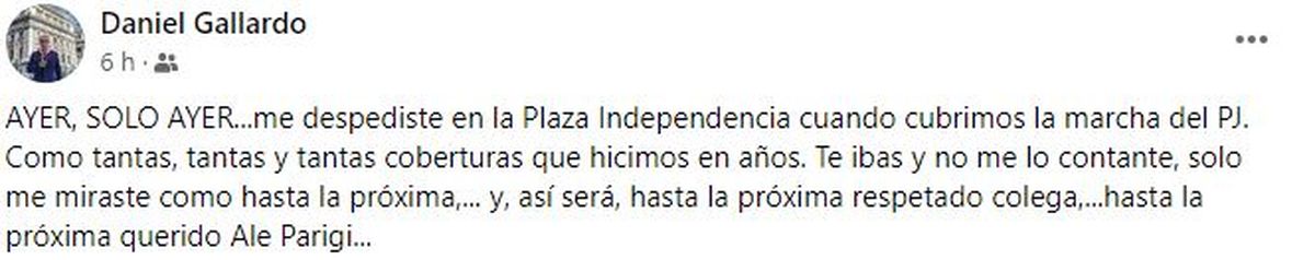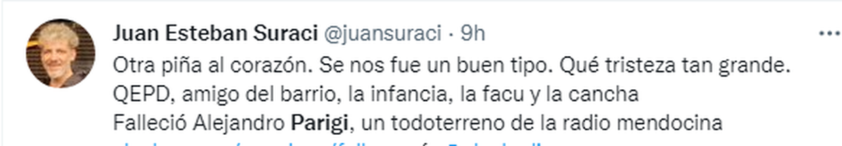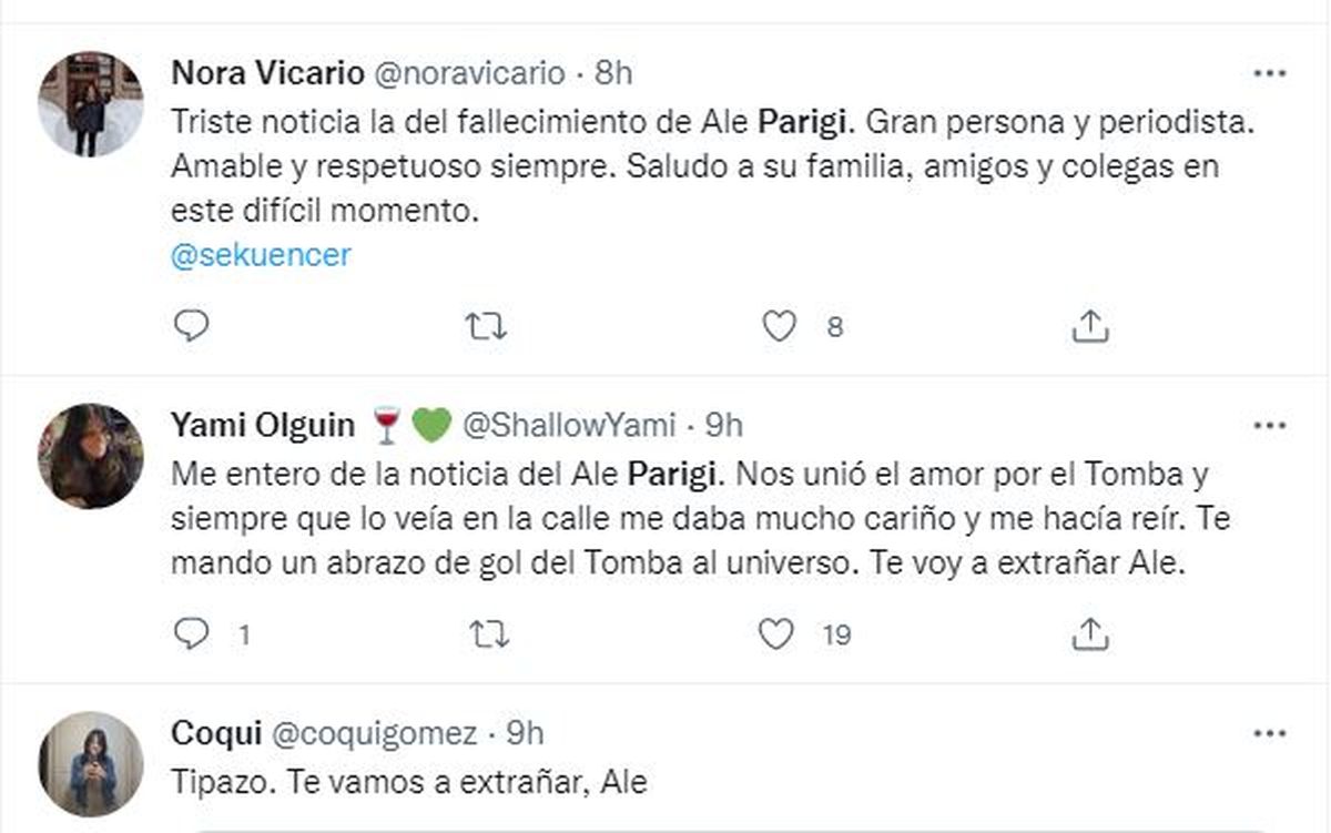 Buen tipo. Buen compañero. Buen amigo. Excelente periodista. Apasionado por el trabajo, por el Tomba y por el rocanrol. Ese fue Alejandro Parigi, quien murió el sábado, a los 58 años lo que generó una fuerte conmoción en el ámbito de los medios de comunicación de la provincia porque en todos tuvo amigos.