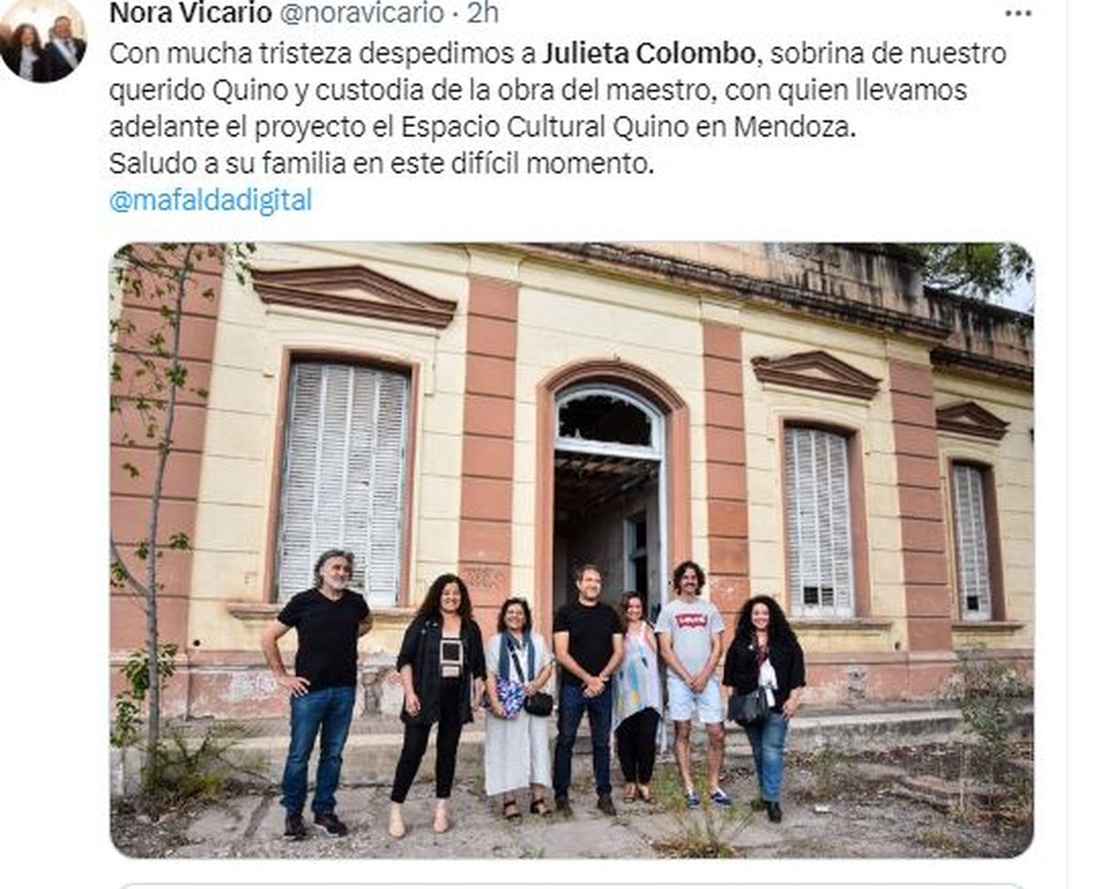 "Con mucha tristeza despedimos a Julieta Colombo, sobrina de nuestro querido Quino y custodia de la obra del maestro, con quien llevamos adelante el proyecto del Espacio Cultural Quino en Mendoza. Saludo a su familia en este difícil momento", manifestó Vicario y publicó una foto con Julieta en la puerta de lo que será el inmueble en el que se homenajeará a Joaquín Lavado.
