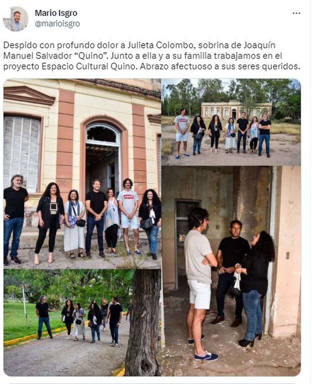 Otro tanto hizo Isgro. "Despido con profundo dolor a Julieta Colombo, sobrina de Joaquín Manuel Salvador Quino. Junto a ella y a su familia trabajamos en el proyecto Espacio Cultural Quino. Abrazo afectuoso a sus seres queridos".