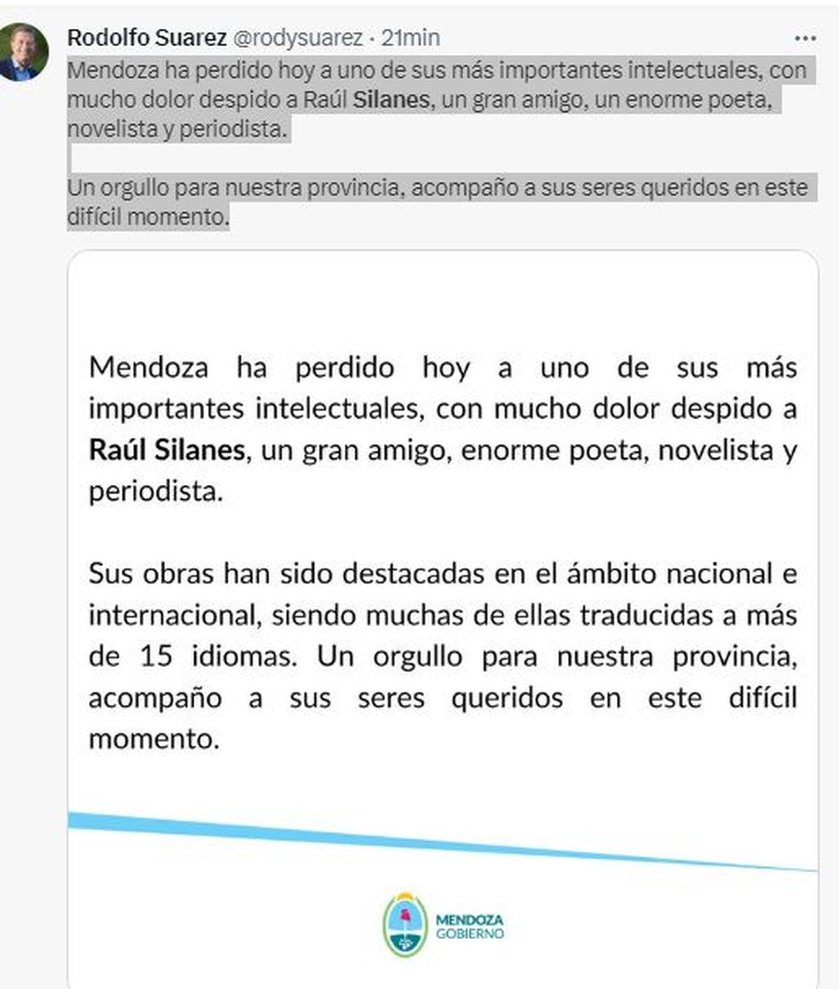 Uno de los primeros en expresarse fue el gobernador Rodolfo Suarez. "Mendoza ha perdido hoy a uno de sus más importantes intelectuales, con mucho dolor despido a Raúl Silanes, un gran amigo, un enorme poeta, novelista y periodista. Un orgullo para nuestra provincia, acompaño a sus seres queridos en este difícil momento"
