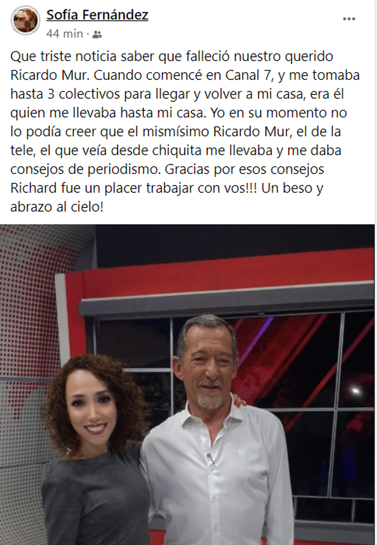 "Qué triste noticia saber que falleció nuestro querido Ricardo Mur. Cuando comencé en Canal 7, y me tomaba hasta 3 colectivos para llegar y volver a mi casa, era él quien me llevaba de vuelta. Yo en su momento no podía creer que el mismísimo Ricardo Mur, el de la tele, el que veía desde chiquita me llevaba y me daba consejos de periodismo. Gracias por esos consejos Richard, fue un placer trabajar con vos!!! Un beso y abrazo al cielo!", contó a su turno Sofía Fernández, periodista de Canal 7.