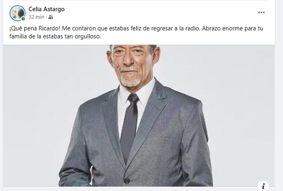 "¡Qué pena Ricardo! Me contaron que estabas feliz de regresar a la radio. Abrazo enorme para tu familia de la que estabas tan orgulloso", escribió Celia Astargo, otro ícono del periodismo de Mendoza.
