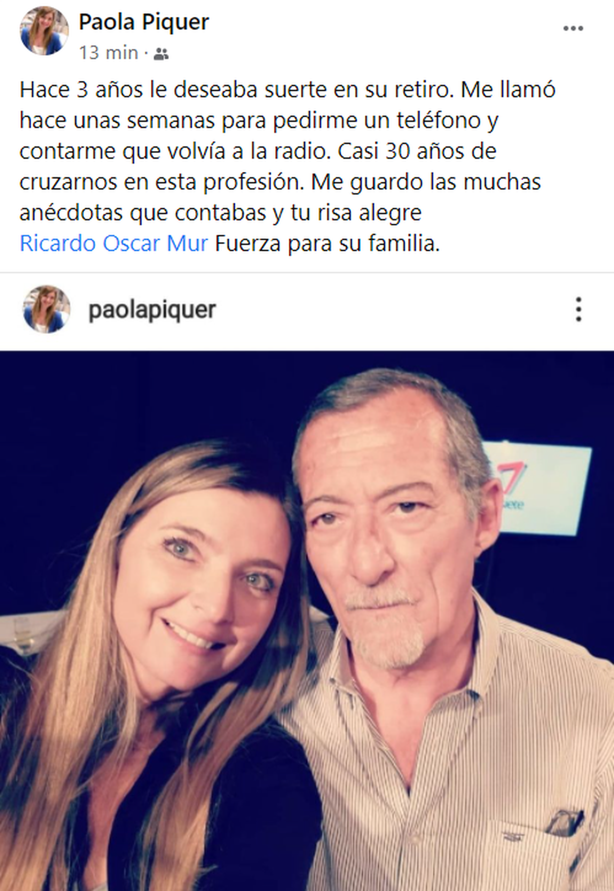 "Hace 3 años le deseaba suerte en su retiro. Me llamó hace unas semanas para pedirme un teléfono y contarme que volvía a la radio. Casi 30 años de cruzarnos en esta profesión. Me guardo las muchas anécdotas que contabas y tu risa alegre. Fuerza para tu familia", reza asimismo el mensaje de Paola Piquer, gerente editorial de Grupo América.