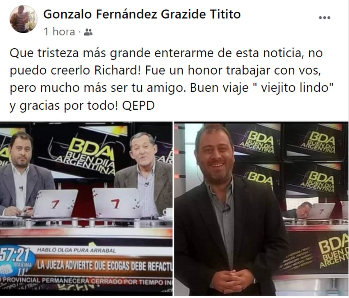 "¡Qué tristeza más grande enterarme de esta noticia, no puedo creerlo, Richard! Fue un honor trabajar con vos, pero mucho más ser tu amigo ¡Buen viaje, ‘viejito lindo’ y gracias por todo! QEPD", expresó Gonzalo "Titito" Fernández, periodista deportivo de radio Nihuil y compañero de trabajo de Ricardo en Canal 7.