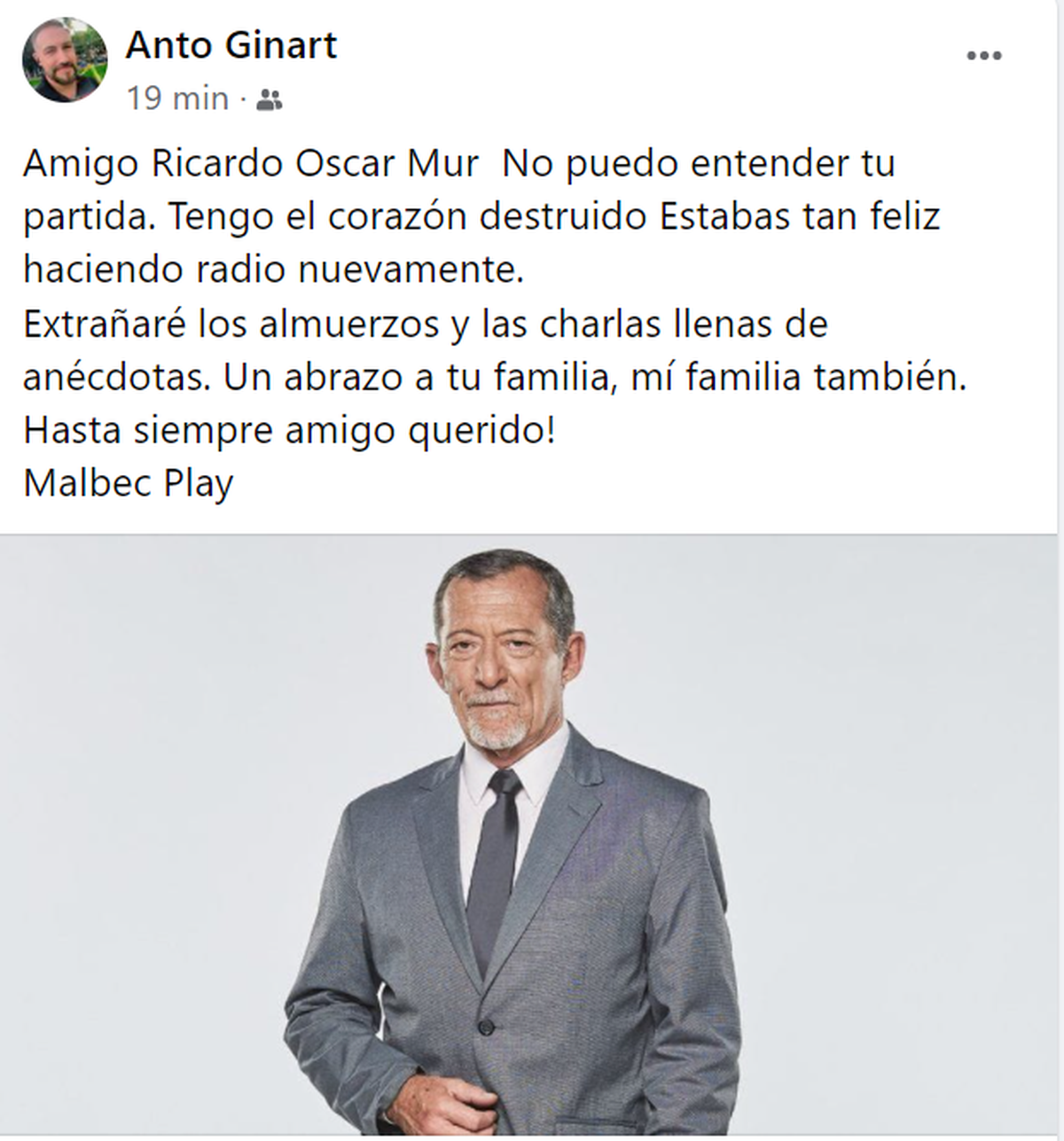 "Amigo Ricardo Mur No puedo entender tu partida. Tengo el corazón destruido. Estabas tan feliz haciendo radio nuevamente. Extrañaré los almuerzos y las charlas llenas de anécdotas. Un abrazo a tu familia, mí familia también. Hasta siempre amigo querido!", escribió conmovido el colega Antonio Ginart.