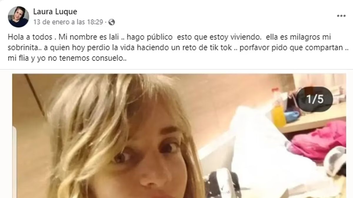 "Hola a todos. Mi nombre es Lali. Hago público esto que estoy viviendo. Ella es Milagros (en referencia a una foto que acompaña el posteo), mi sobrinita, quien hoy (por el último viernes) perdió la vida haciendo un reto de TikTok. Por favor pido que compartan. Mi familia y yo no tenemos consuelo", publicó la mujer junto con una foto de la niña.