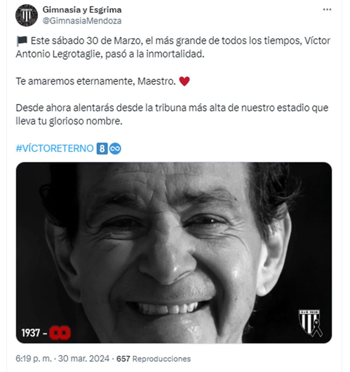 Víctor Legrotaglie, la emblemática figura de Gimnasia y Esgrima, quien el pasado miércoles fue hospitalizado por problemas respiratorios en el Hospital El Carmen, murió este sábado a sus 86 años.