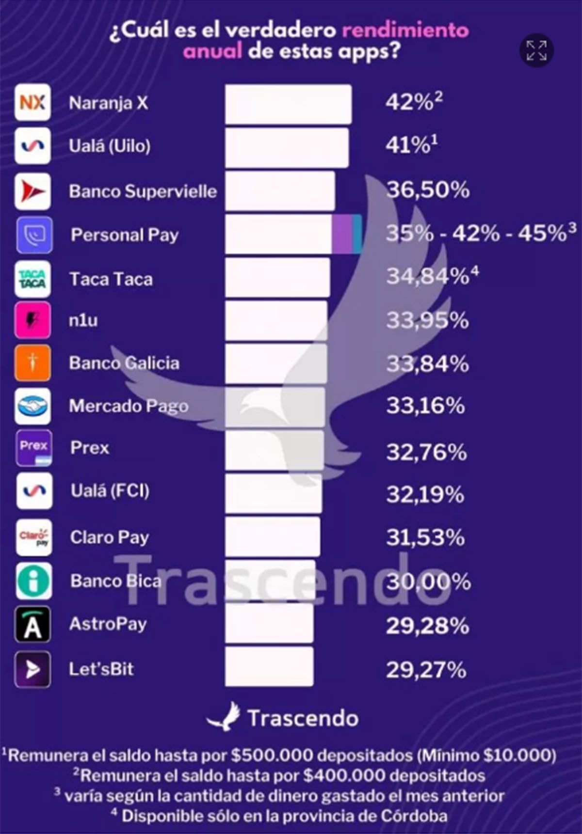 El informe de Trascendo indica que su análisis no utiliza la Tasa Efectiva Anual (TEA), que es lo que realmente se gana al final del año, sino el rendimiento total de la inversión según el último rendimiento diario de cada app. Esto se debe a que cada app tiene un criterio distinto para definir y publicar la Tasa Nominal Anual (TNA) en sus páginas. Así, se compara el efecto real que tiene cada día tener el dinero en una u otra aplicación.