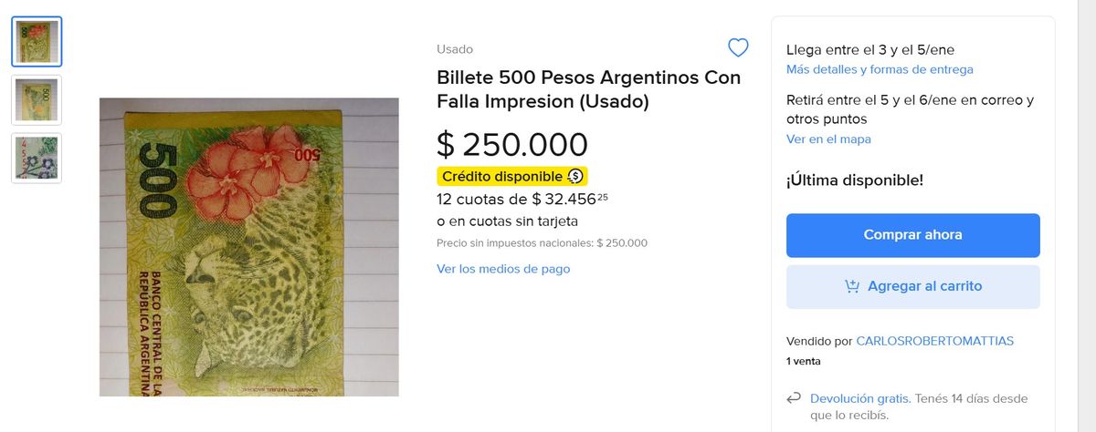 En Mercado Libre, un aficionado a la numismática está ofreciendo un billete de este tipo con un grosero error de impresión, algo que incrementa notablemente su valor inicial. En su reverso, el BCRA imprimió accidentalmente tres flores y sobre una flor quedó estampado el número de serie del papel moneda. Algo extraño y poco frecuente, por lo que coleccionistas podrían hacerse con un verdadero tesoro a un bajo precio.