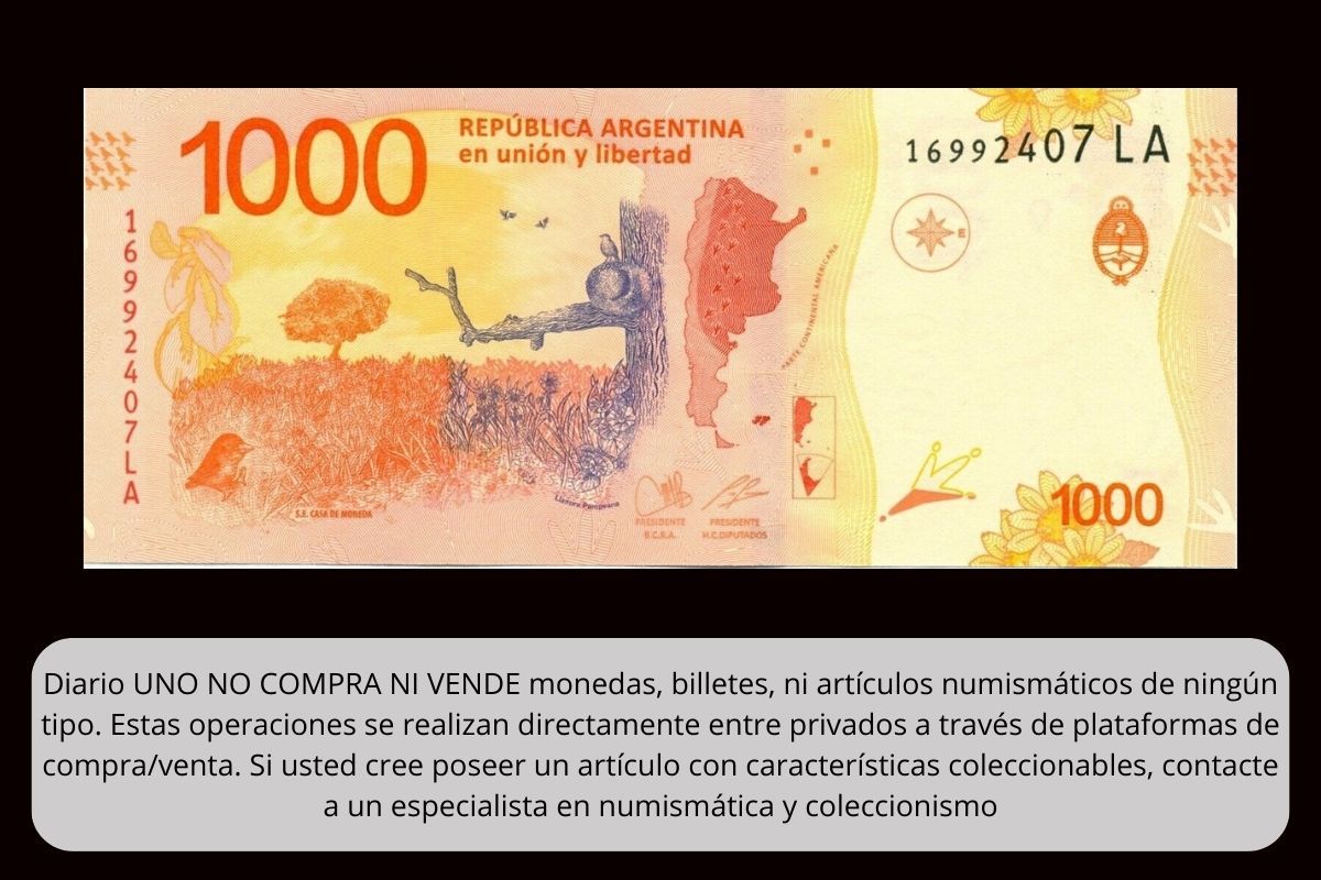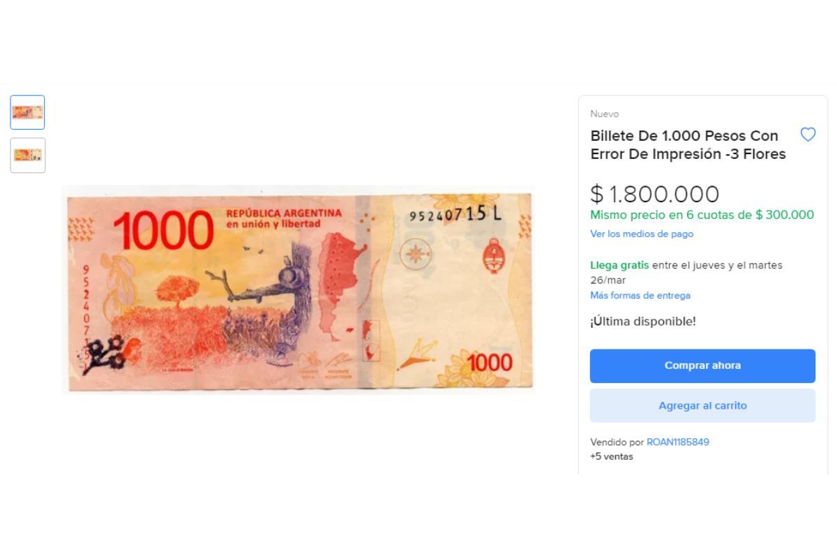 En un mayor detalle, el siguiente billete de 1000 pesos es un artículo que fue publicado en la reconocida plataforma de compraventa de Mercado Libre. Con el característico pájaro Hornero dibujado en el centro de este billete, el dueño de este artículo afirma que este ejemplar de 1000 pesos presenta un error de impresión sobre el ángulo inferior izquierdo, que afecta a las figuras de 3 flores. Por este motivo, varios coleccionistas de monedas y billetes muestran su interés por este artículo que se presenta en pocas oportunidades.