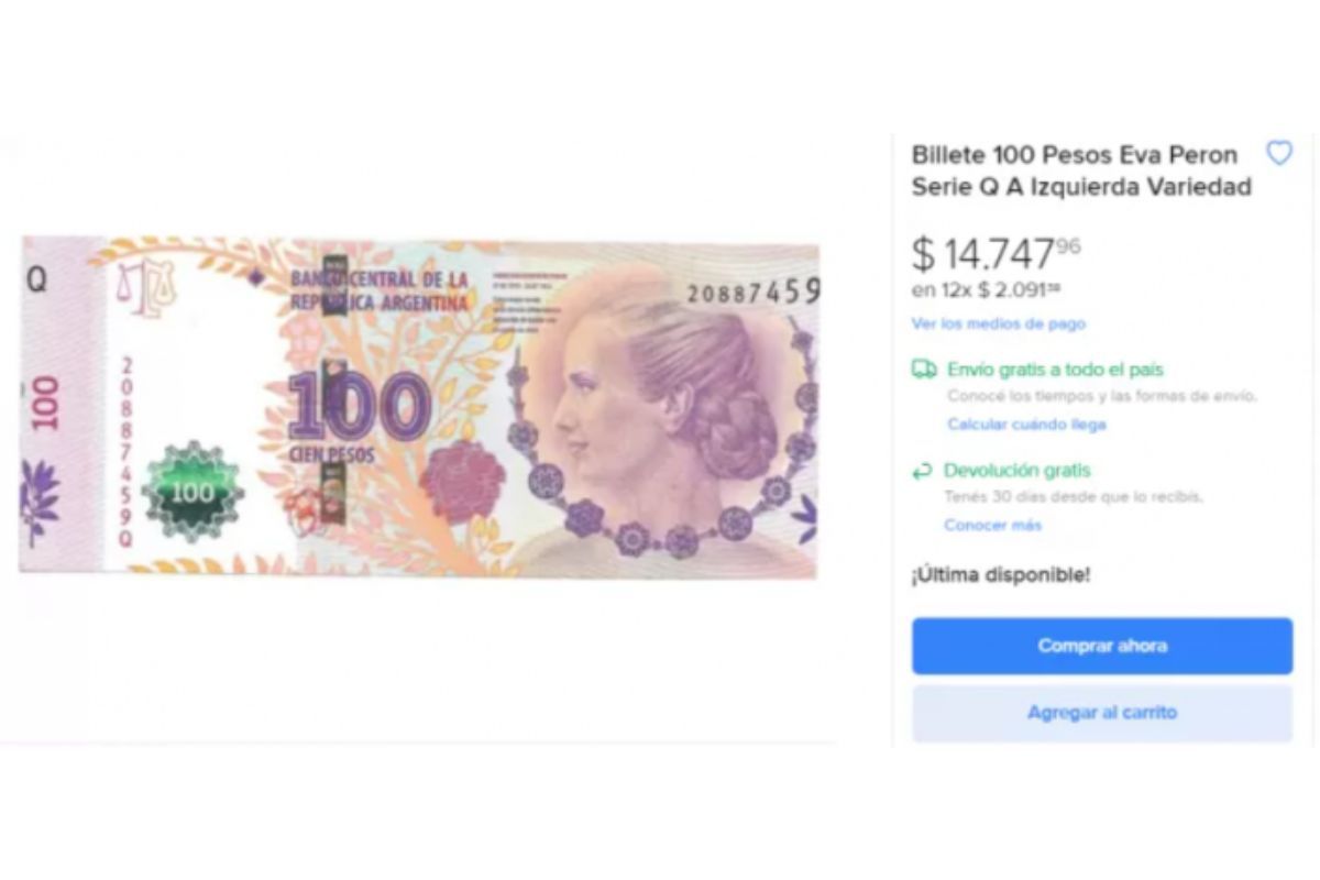 La colección de monedas y billetes puede puede generar grandes sumas de dinero, en especial para los que practican la numismática ya que están dispuestos a pagar hasta 14 mil pesos por el billete de 100 pesos. Según Mercado Libre, este ejemplar de 100 pesos que tiene Eva Perón en su centro, la ex primera dama de la nación, tiene errores de impresión donde puede verse tanto la figura central como el valor del billete.