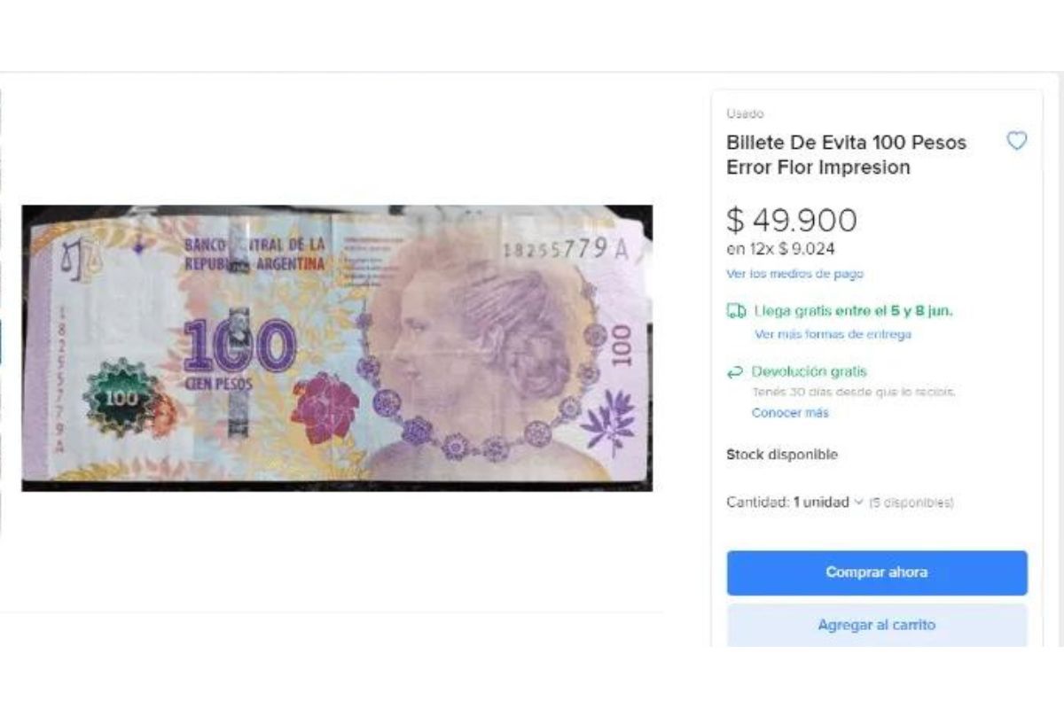 La numismática es una actividad basada en la colección de monedas y billetes, y las cuales pueden tener un valor de venta superior al que poseen. Es así que el billete de 100 pesos, en la plataforma de Mercado Libre, es cotizado hasta los 49 mil pesos. El ejemplar, que cuenta con la imagen de Eva Perón en su centro, tiene defectos en su impresión con una flor que está mal ubicada y no donde dice 100 pesos.