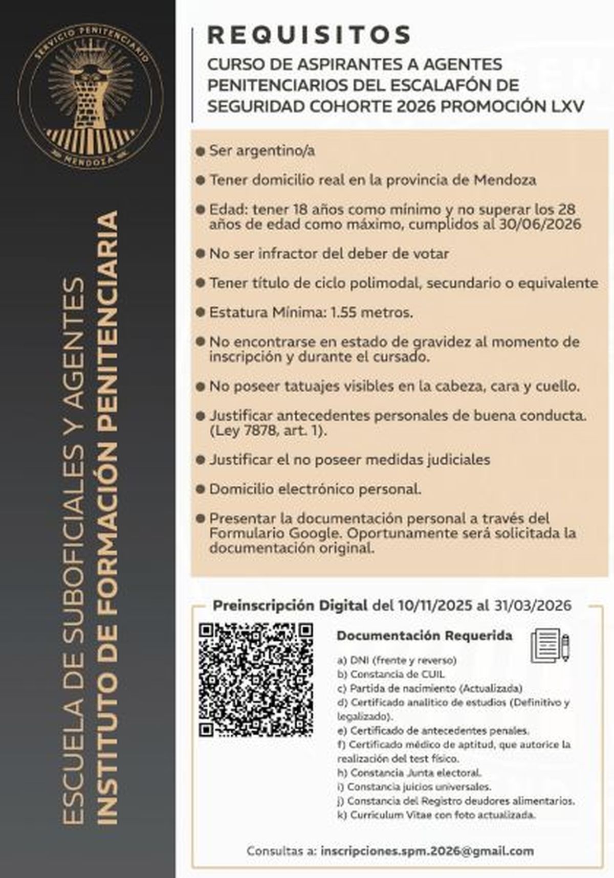El Servicio Penitenciario de Mendoza continúa impulsando la convocatoria de las preinscripciones al “curso de aspirantes a agentes penitenciarios del escalafón de seguridad”.