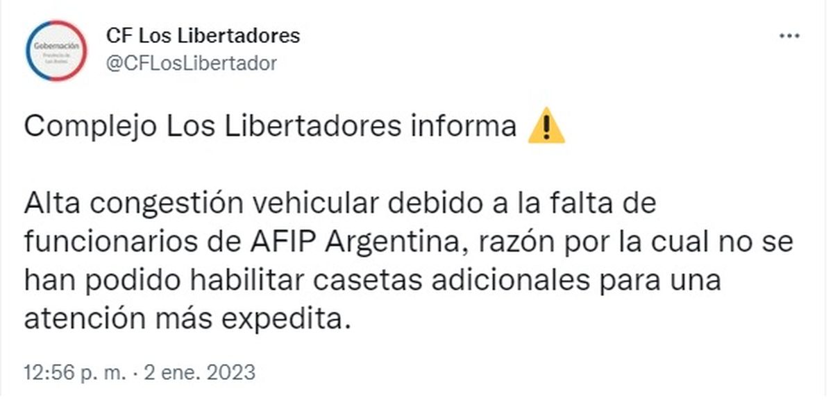Así, en la cuenta de Twitter del Paso Fronterizo @CFLosLibertadores, publicaron este lunes un tuit culpando a la AFIP por las demoras.