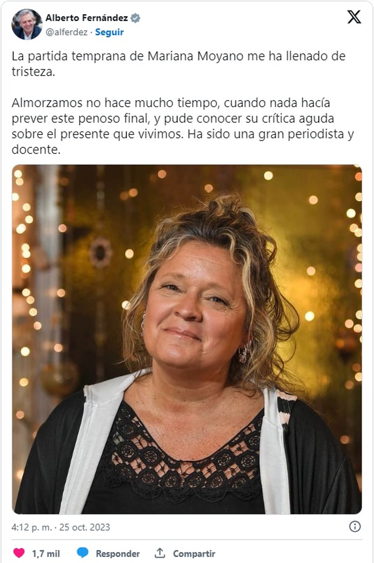 "La partida temprana de Mariana Moyano me ha llenado de tristeza. Almorzamos no hace mucho tiempo, cuando nada hacía prever este penoso final, y pude conocer su crítica aguda sobre el presente que vivimos. Ha sido una gran periodista y docente", expresó el presidente Alberto Fernández desde su cuenta de X.