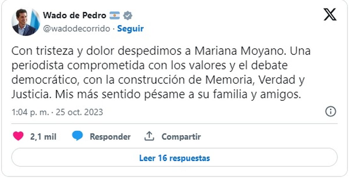 El ministro del Interior, Eduardo "Wado" de Pedro, también hizo llegar su "más sentido pésame a su familia y amigos" y describió a Moyano como "una periodista comprometida con los valores y el debate democrático, con la construcción de Memoria, Verdad y Justicia".