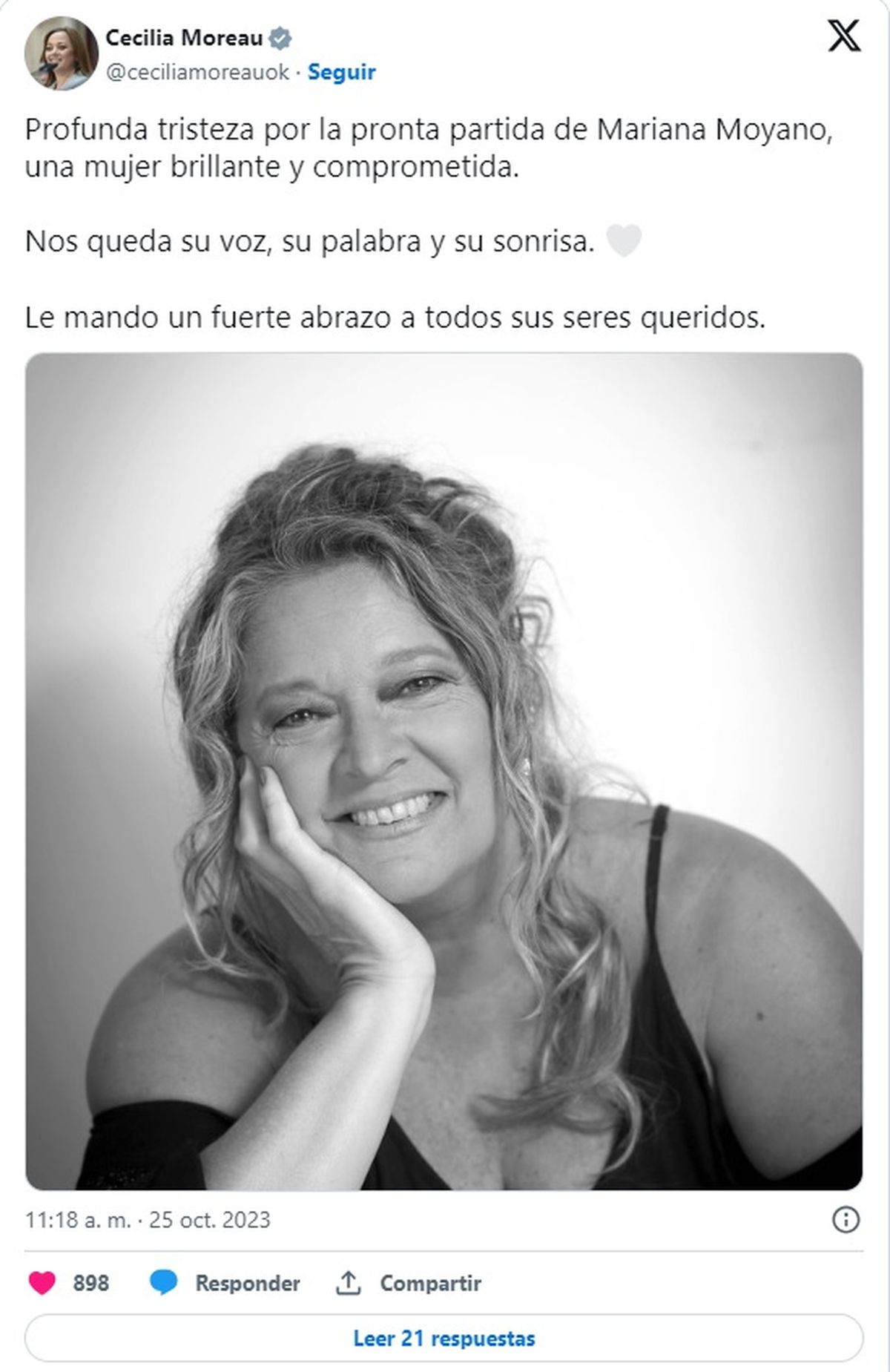 La presidenta de la Cámara de Diputados, Cecilia Moreau, expresó su "profunda tristeza por la pronta partida de Mariana Moyano" a quien definió como "una mujer brillante y comprometida" de quien "nos queda su voz, su palabra y su sonrisa".