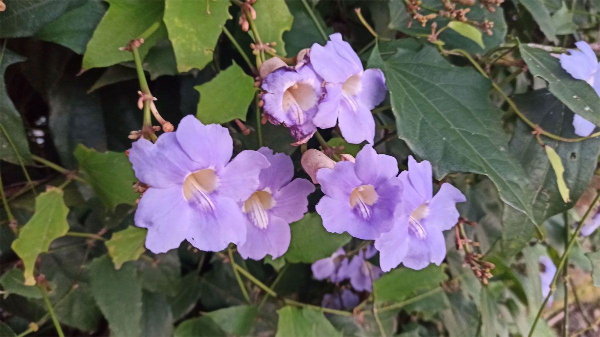 - Enredadera de trompeta azul: es originaria de la India, es muy trepadora y crece de manera muy rigurosa. Posee hojas en forma de corazón de color verde brillante y flores en forma de trompeta de tono azul lavanda.
