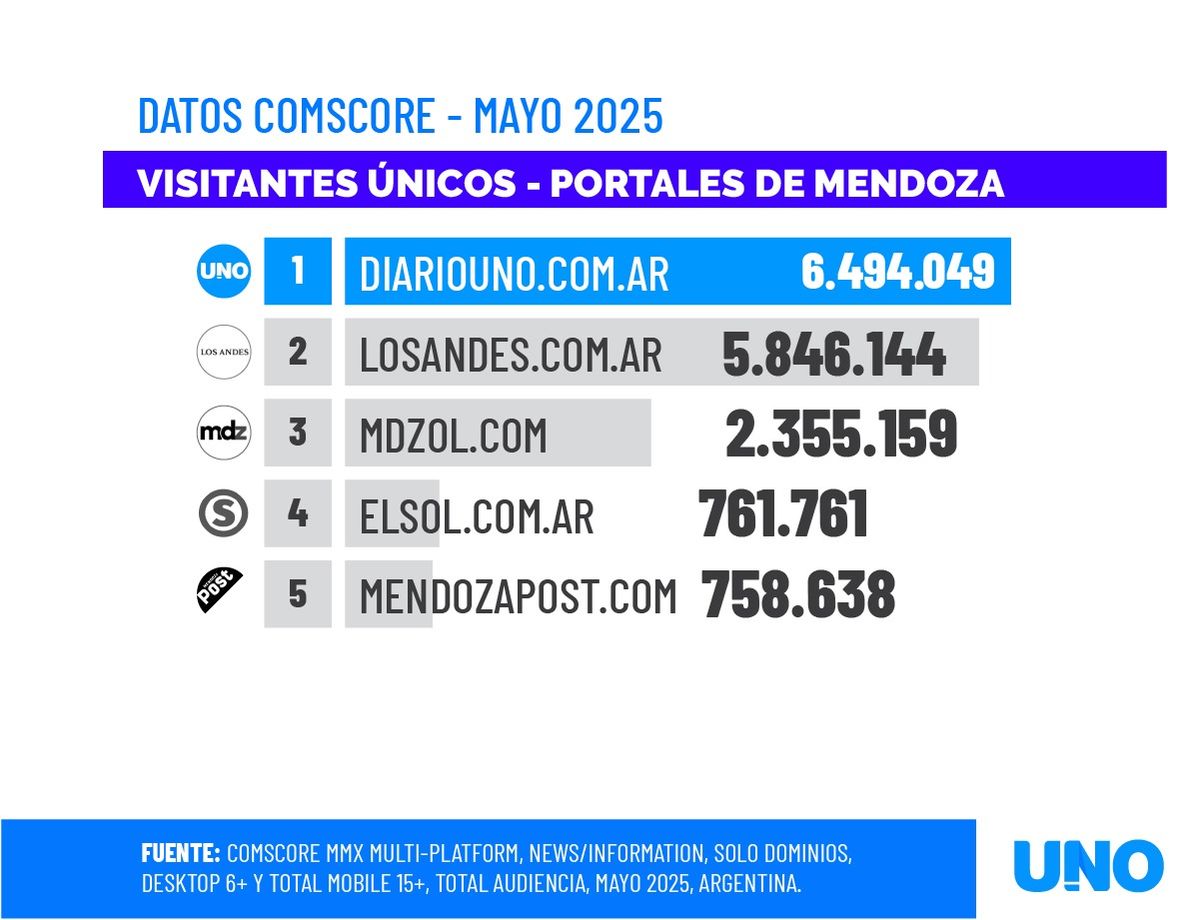 En el plano provincial, los números de mayo muestran a Diario UNO con 6.494.000 visitantes únicos, seguido por Los Andes, con 5.846.000, mientras que el tercer portal de Mendoza, MDZ Online, se ubica a una distancia considerable con 2.355.000.