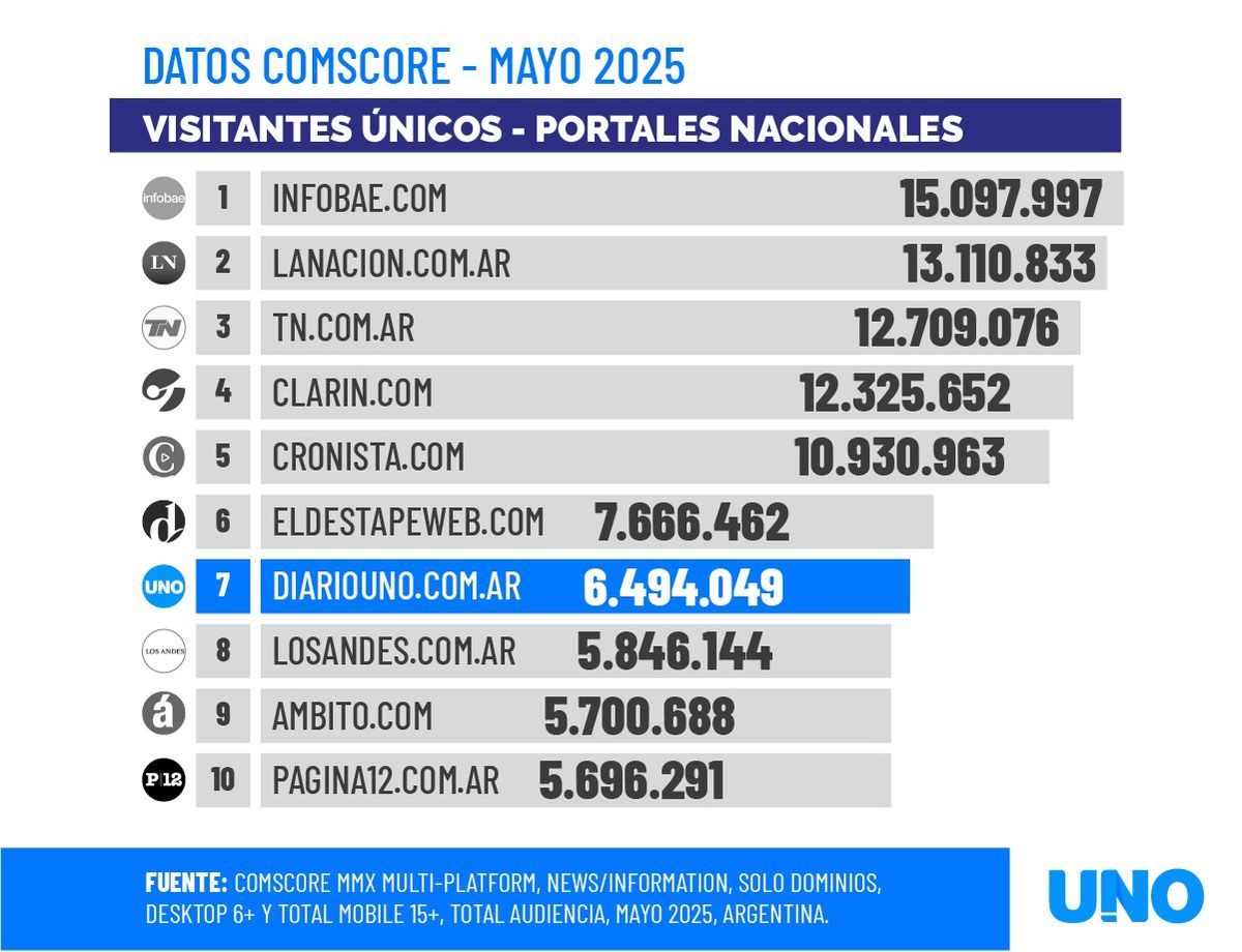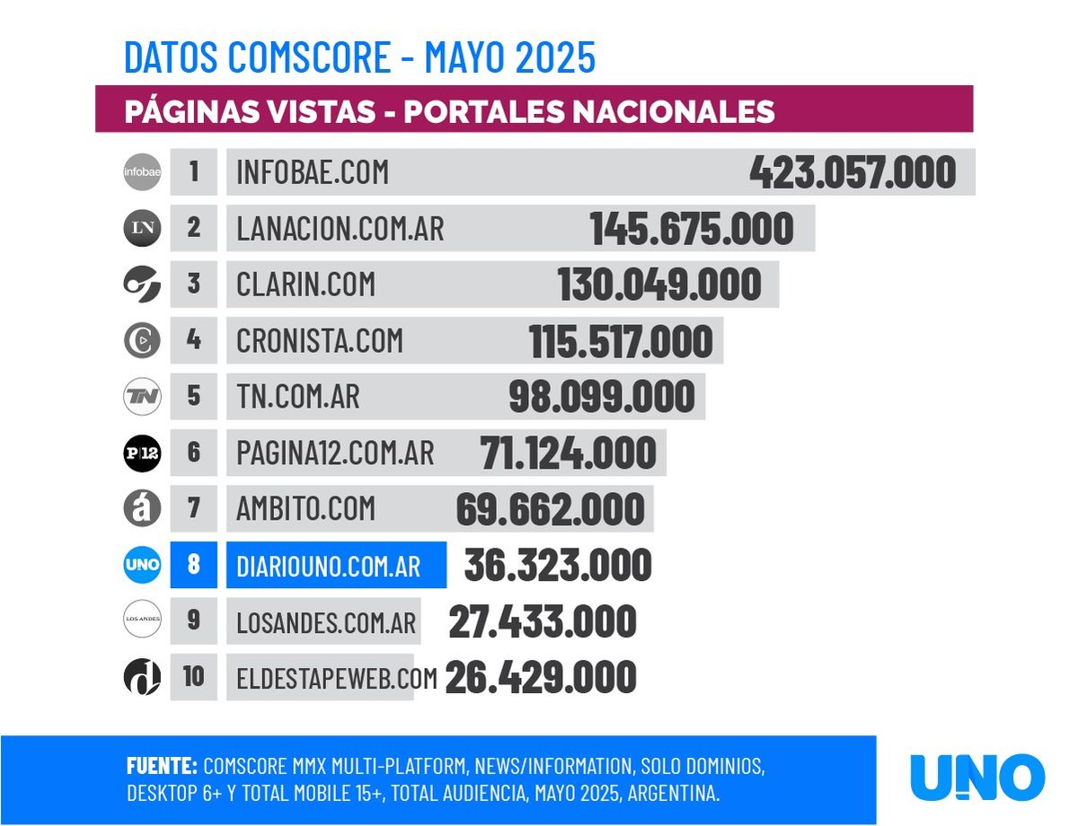 De hecho, el ranking nacional de mayo está encabezado por Infobae, seguido por La Nación, TN, Clarín, Cronista y El Destape, con Diario UNO ocupando una sólida séptima posición, por encima de otros medios de gran trayectoria nacional.