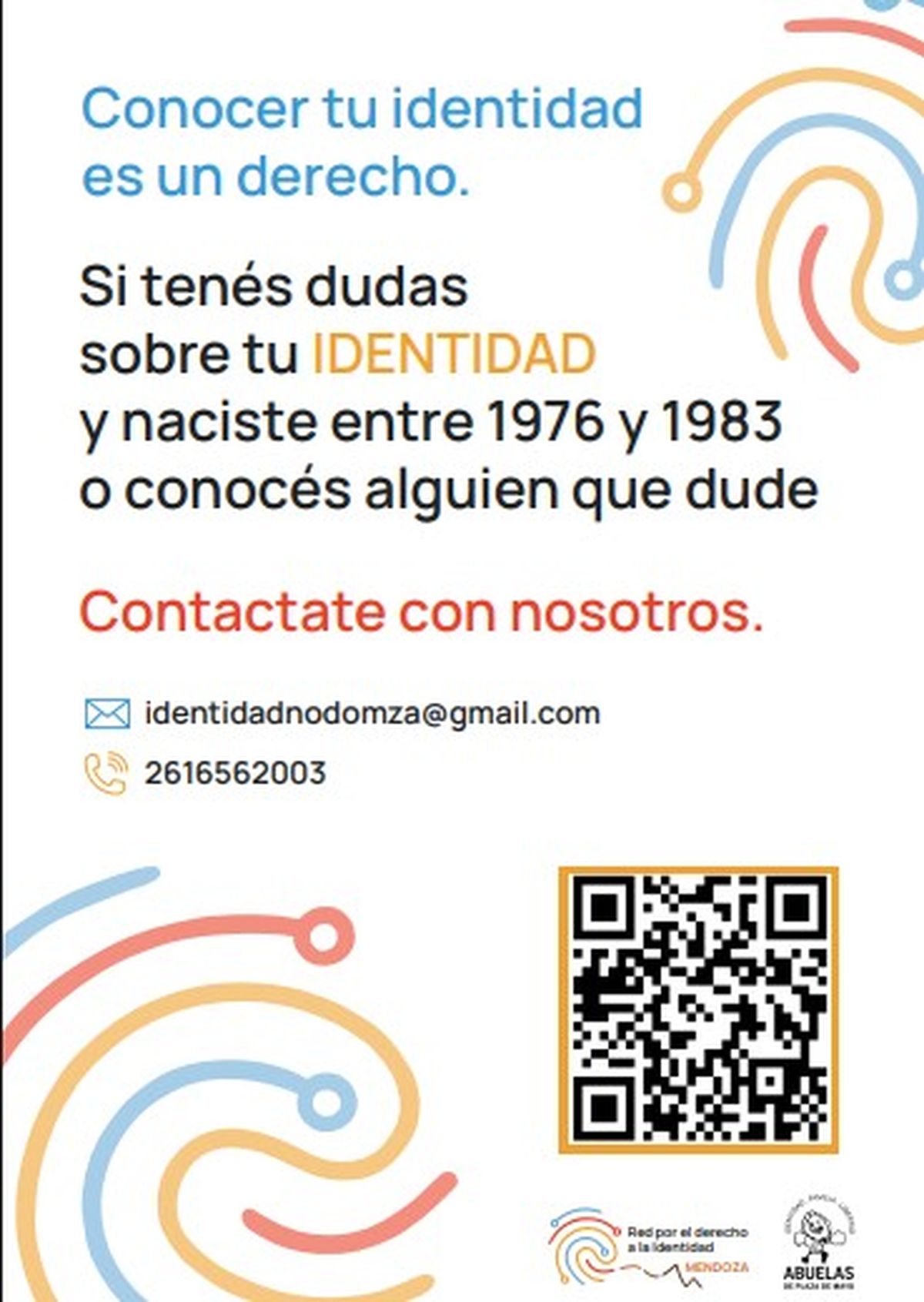 Para ponerse en contacto con el Nodo Abuelas se puede escribir al mail [email protected], o telefónicamente al 2616562003. El Nodo Abuelas funciona en el D2 Espacio para la Memoria, Belgrano 179, 1er piso (entre Peltier y Virgen del Carmen de Cuyo). También a través de Instagram: @epm_exd2_mendoza
