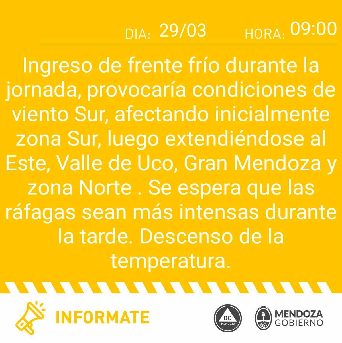 "Ingreso de frente frío durante la jornada, provocaría condiciones de viento Sur, afectando inicialmente zona Sur, luego extendiéndose al Este, Valle de Uco, Gran Mendoza y zona Norte. Se espera que las ráfagas sean más intensas durante la tarde. Descenso de la temperatura", detalla el alerta meteorológico de Defensa Civil.