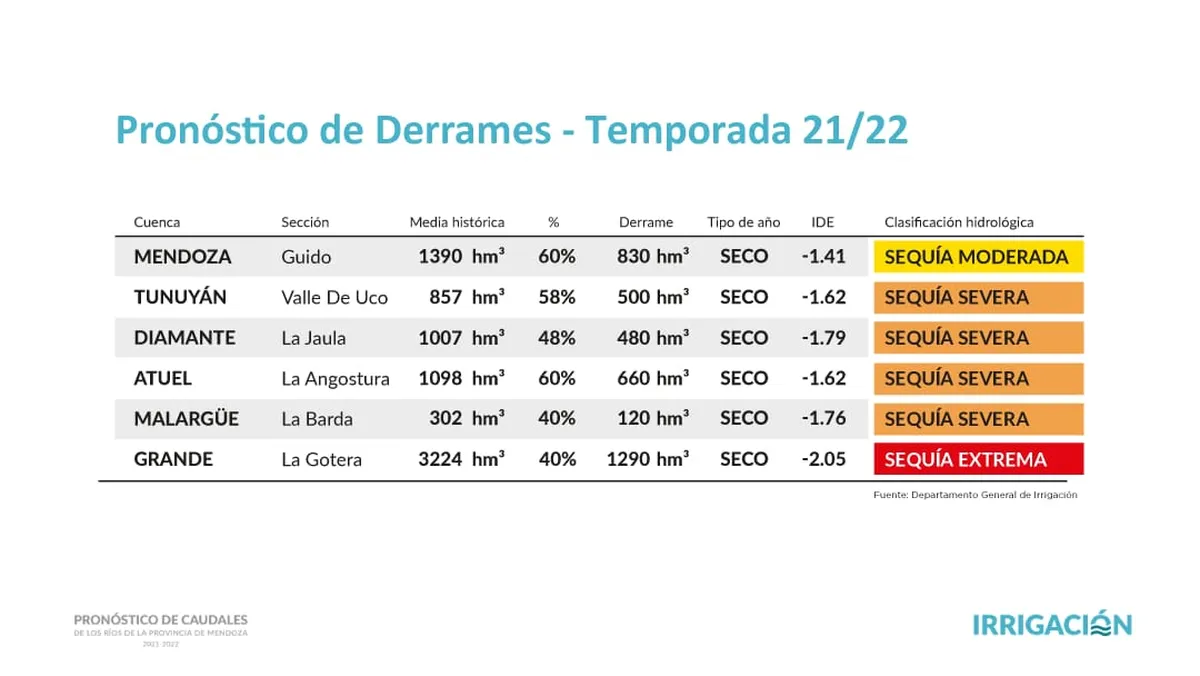 Ya en octubre del año pasado se preanunciaba el problema de la sequía en Mendoza que todavía no afectaba al afluente del dique Potrerillos, el río Mendoza, que era el único que presentaba la calificación de "sequía moderada", mientras el resto (Tunuyán, Diamante, Atuel, Malargüe y Grande) entró en la categoría de "sequía severa o extrema".