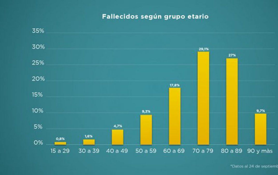 El grupo etario más vulnerable frente a la enfermedad sigue siendo el de los adultos mayores. El 73,9 % de los fallecidos tiene entre 60 y 89 años y las personas de más de 90 años representan casi el 10%.