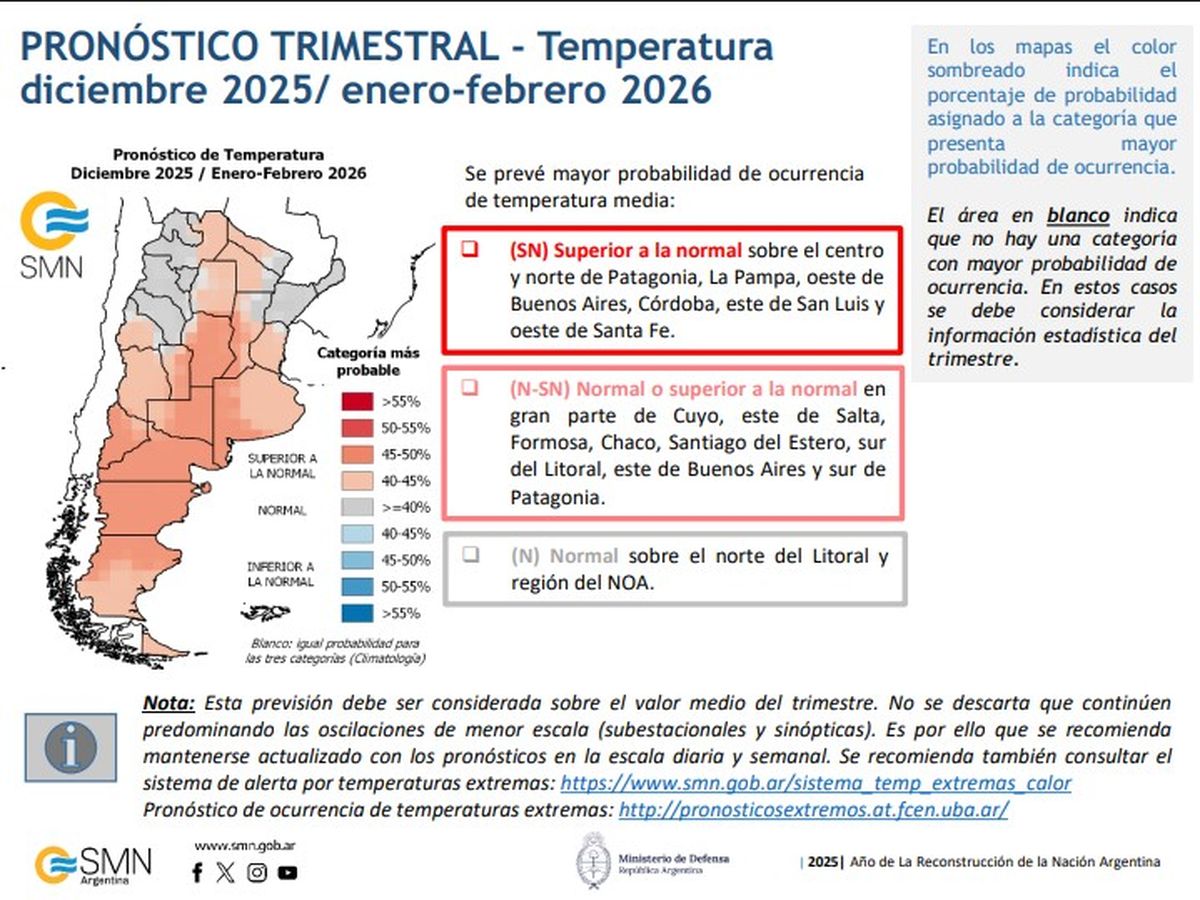 De acuerdo con los mapas, Mendoza y la zona de Cuyo tendrá temperaturas superiores a las normales y este fenómeno se dará también en este de Salta, Formosa, Chaco, Santiago del Estero, sur del Litoral, este de Buenos Aires y sur de Patagonia.