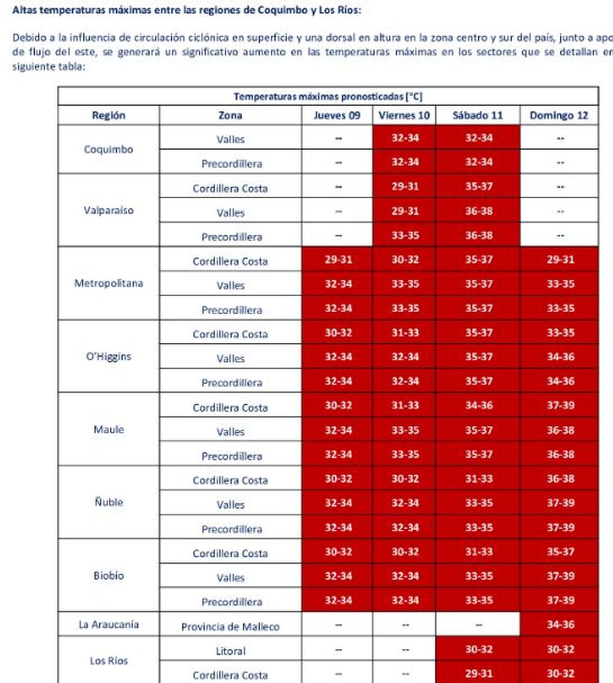 El organismo meteorológico detalló que las regiones afectadas por el calor intenso serán Coquimbo, Valparaíso, Metropolitana, O’Higgins, Maule, Ñuble y Biobío. No se descarta que en alguna de esas secciones se produzca una máxima de 39ºC.