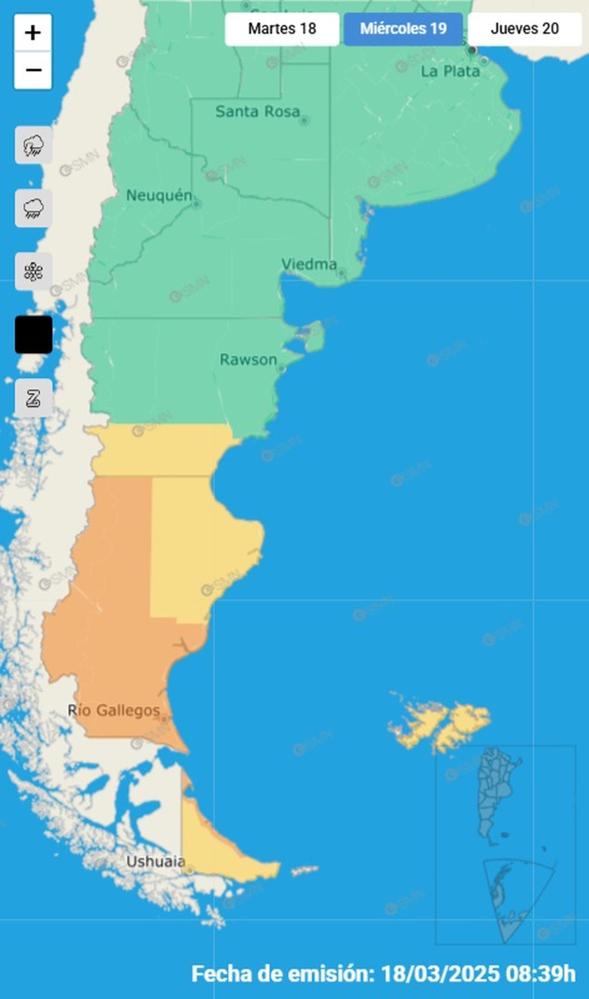 En particular, sobre Tierra del fuego y las zonas costeras de Santa Cruz, durante la madrugada, la dirección del viento predominará del sector norte y luego tenderá a rotar al noroeste y oeste entre la mañana y la tarde.